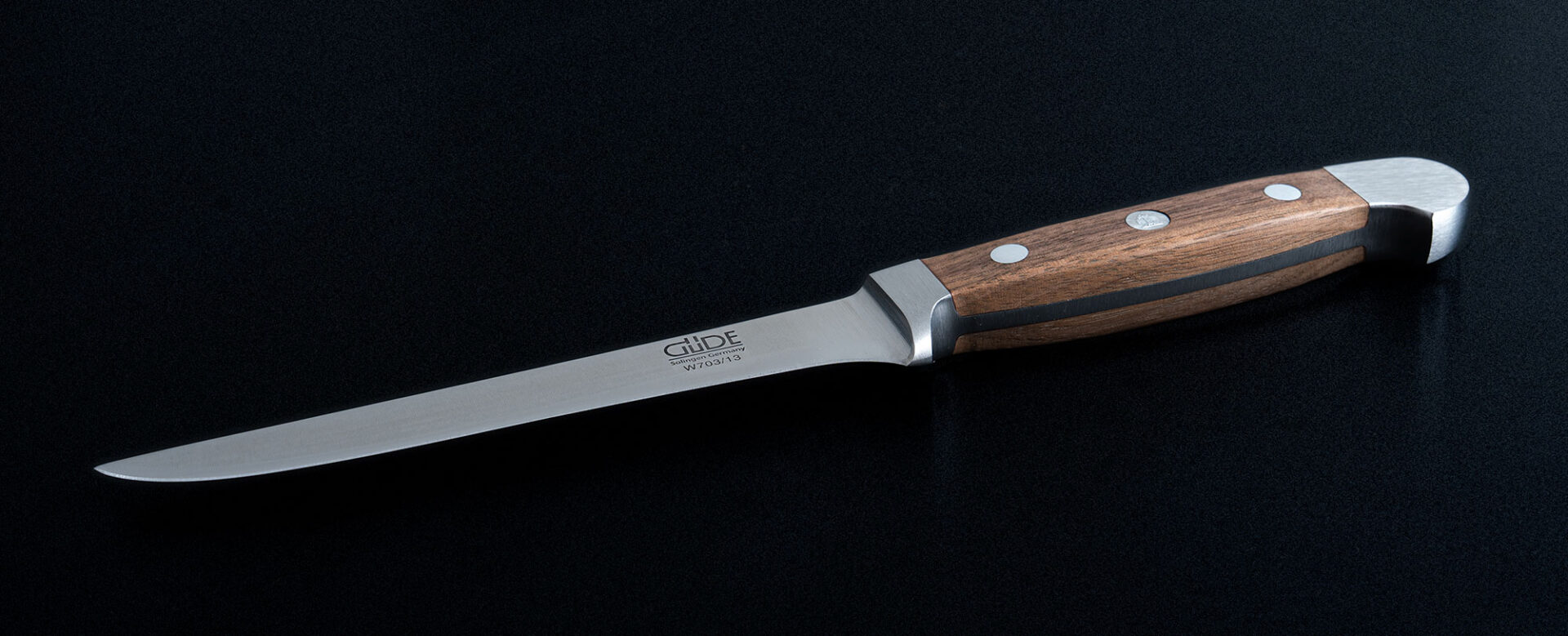 Flexible Klinge folgt jeder Gräte, Walnussgriff gibt auch nass perfekten Halt.