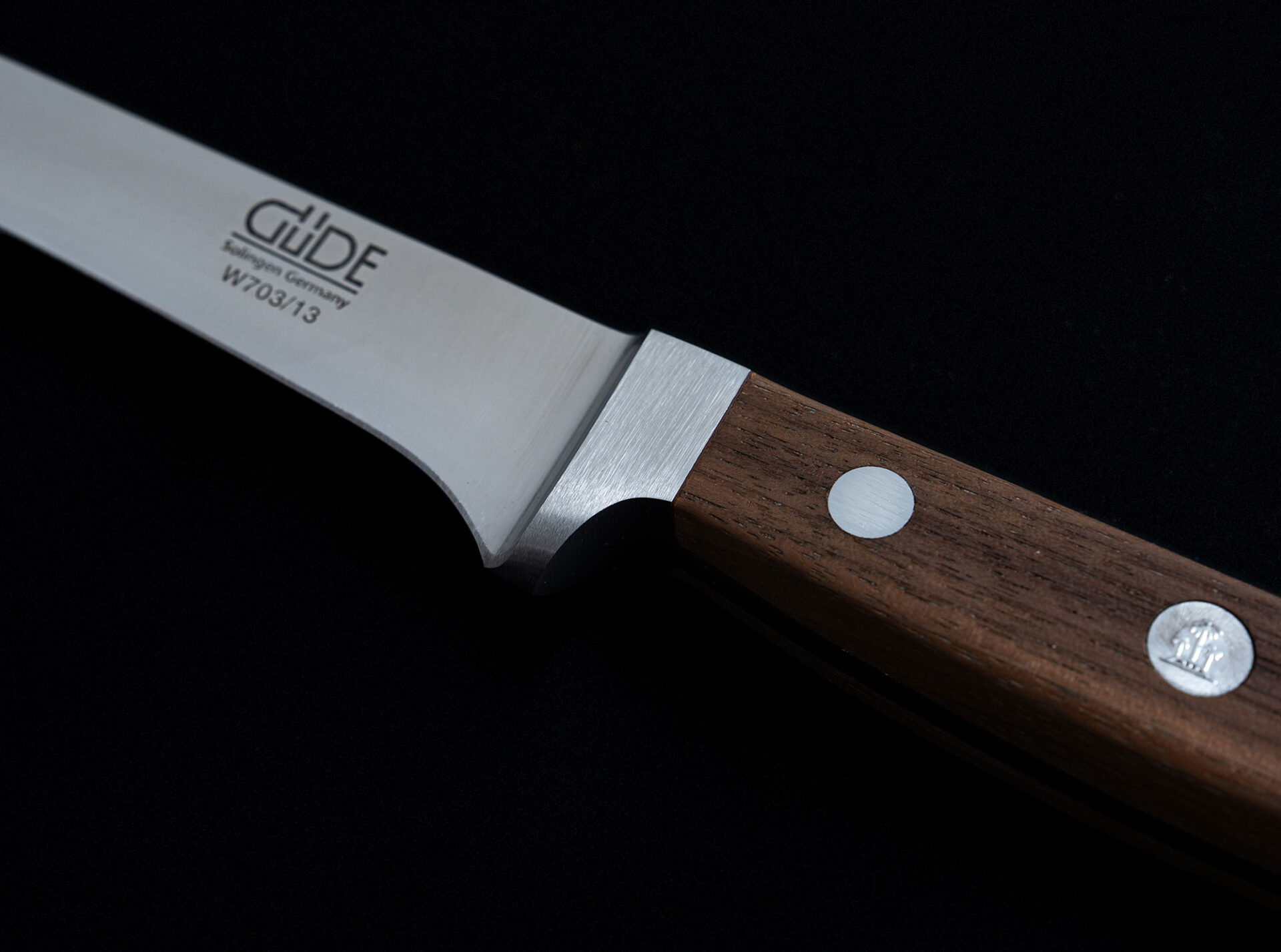 Die Güde Alpha Walnuss-Serie steht für hochwertige, vollkommen handgefertigte Schmiedekunst aus Solingen: Jedes Messer entsteht in über 40 präzisen manuellen Arbeitsgängen aus einem Stück Chrom-Vanadium-Molybdän-Messerstahl, der rostfrei, eisgehärtet und handgeschärft wird – für dauerhaft scharfe, langlebige Klingen.