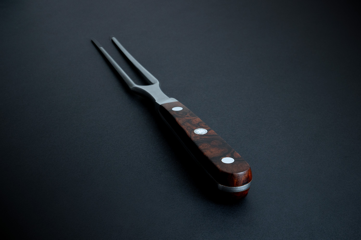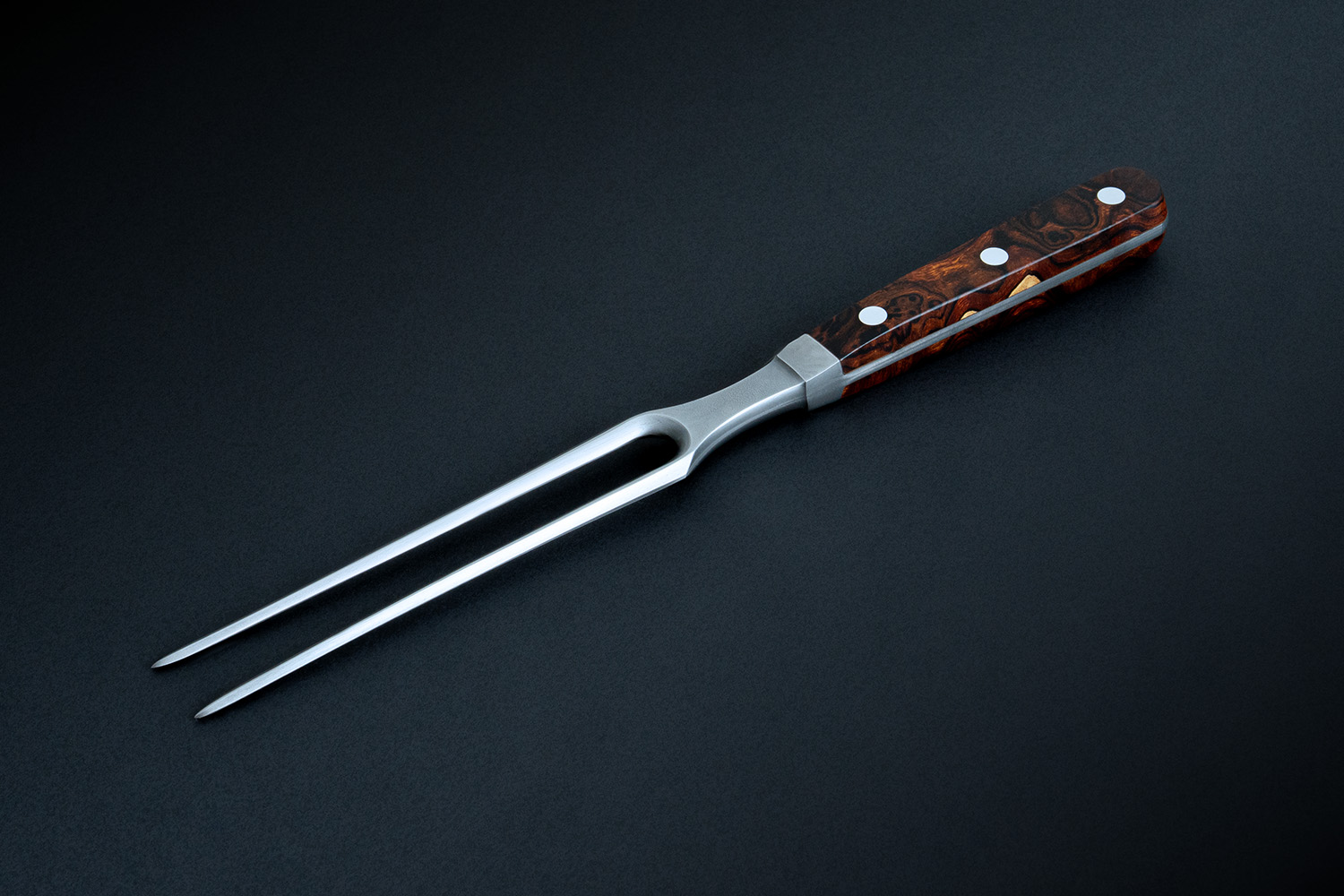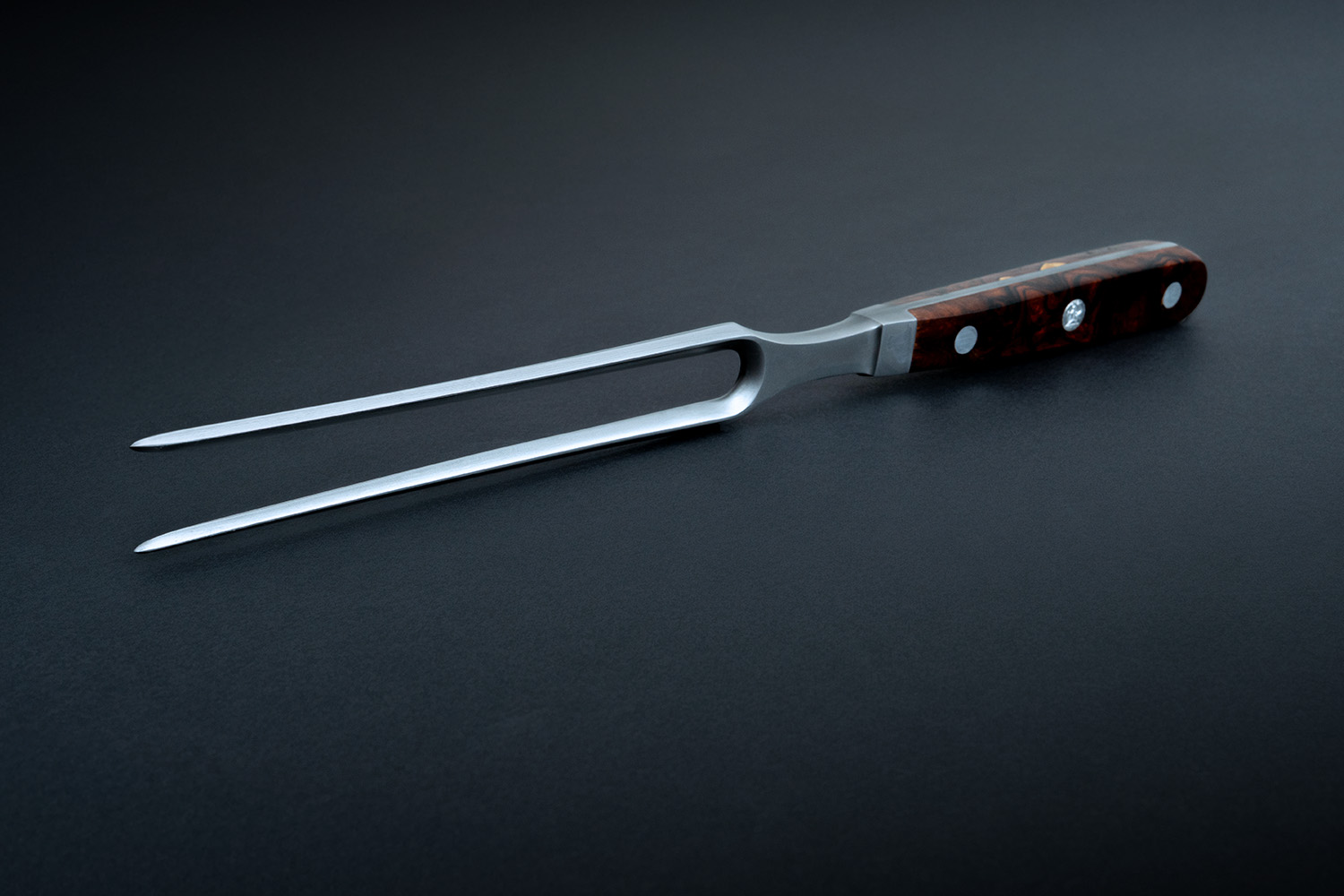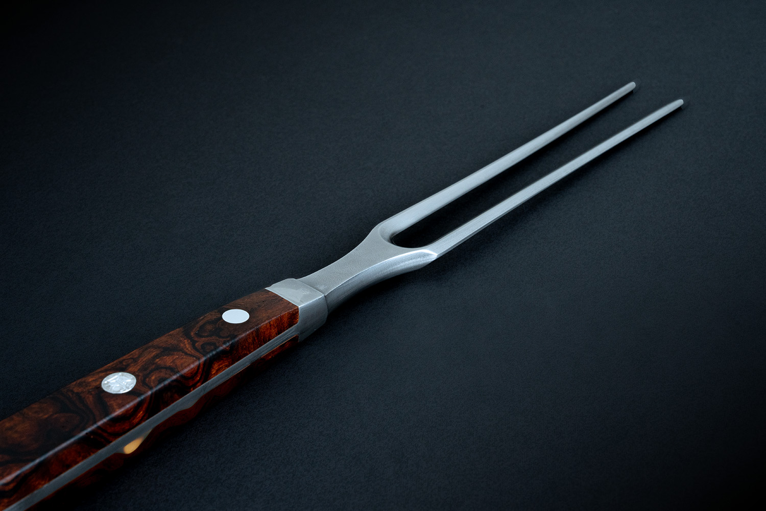 Die Fleischgabel aus Damaststahl mit Wüsten-Eisenholzgriff gleitet mit zwei spitzen Zinken präzise durch jeden Braten.