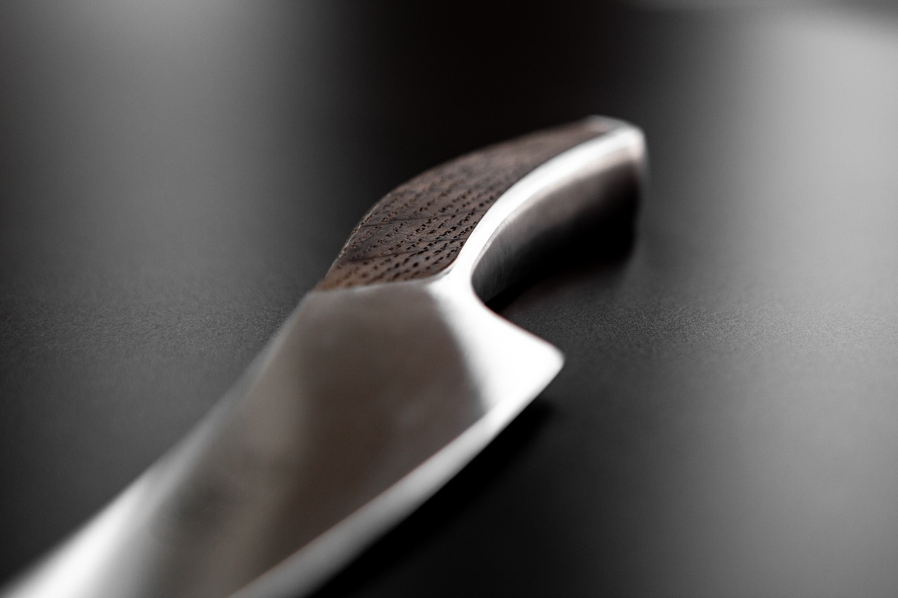Vollmetall-Klinge mit asiatischer Schneidegeometrie und geräuchertem Eichengriff – Präzision trifft Handwerk.